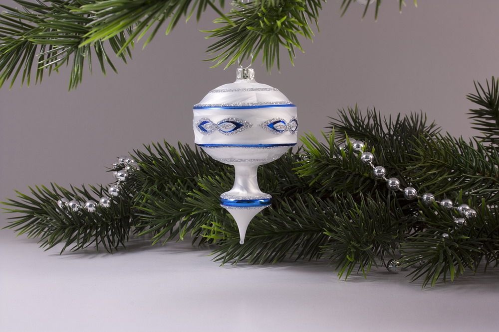 Traditionell hergestellte Weihnachtskugeln in weiß blau aus Lauscha - exklusiv, edel und einzigartig.